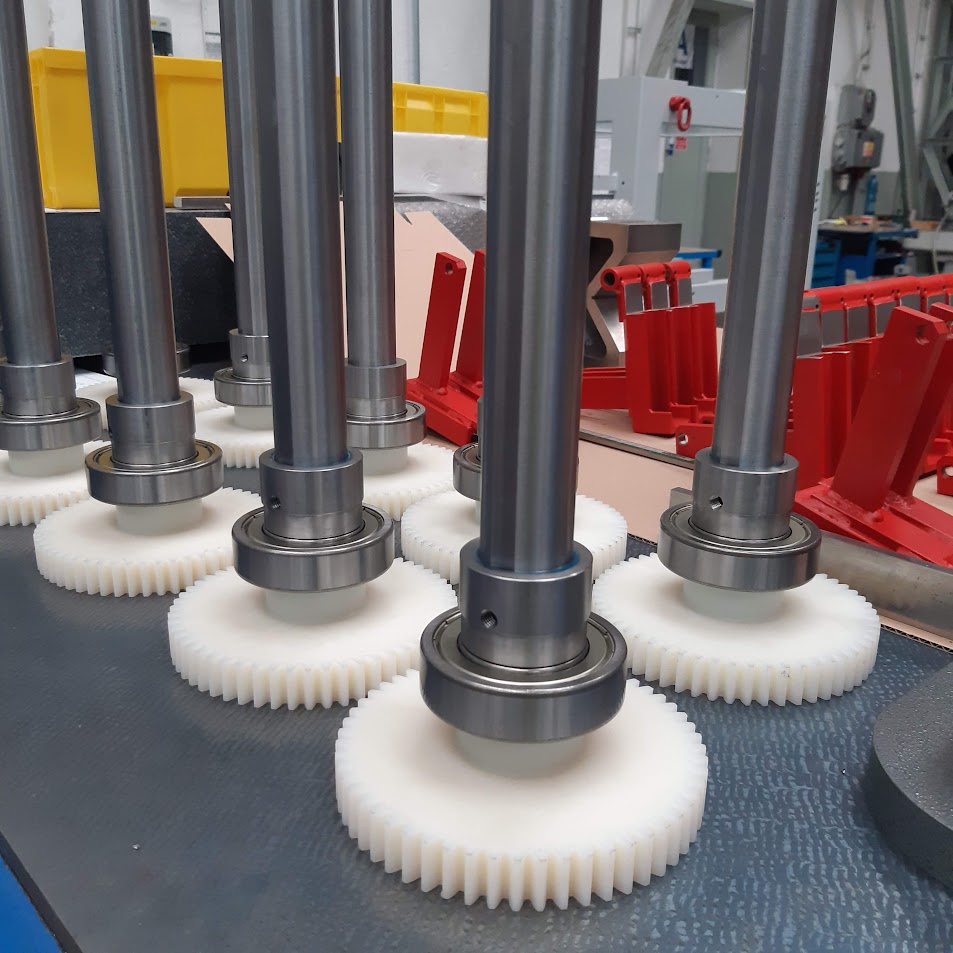 Převody a náhony ozubených kol z oceli, barevných kovů i plastů, vodící a řadící tyče kruhové, šesti i více drážkové, ložisková uložení vodících tyčí pro náhony a další.